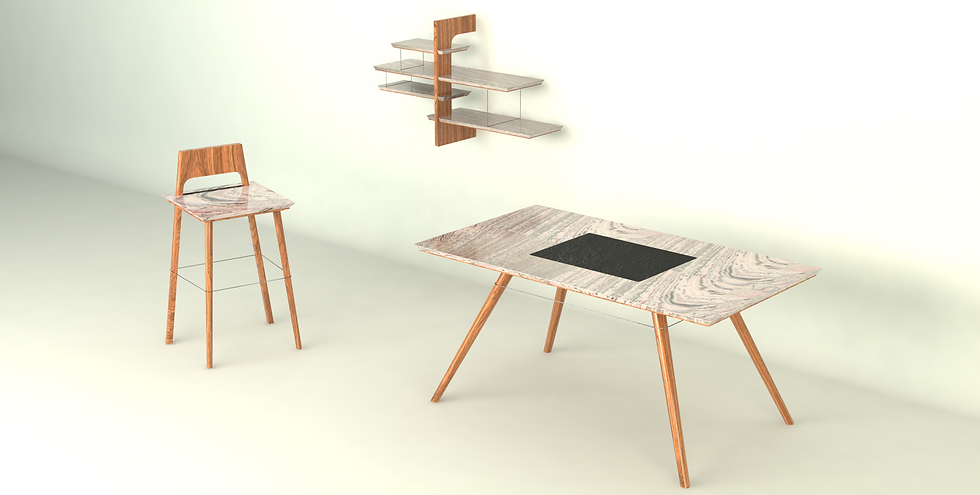 Guided by the Italian designer Stefano Caggiano, along with other two colleagues - Valeria Venditti and Luis Huerta - we have designed three pieces that, yet very honest in their conexions and structure, managed to maintain their elegance by the use of the wood and marble aesthetics.